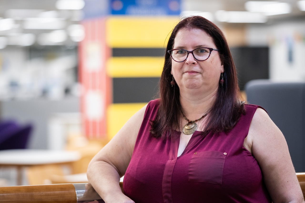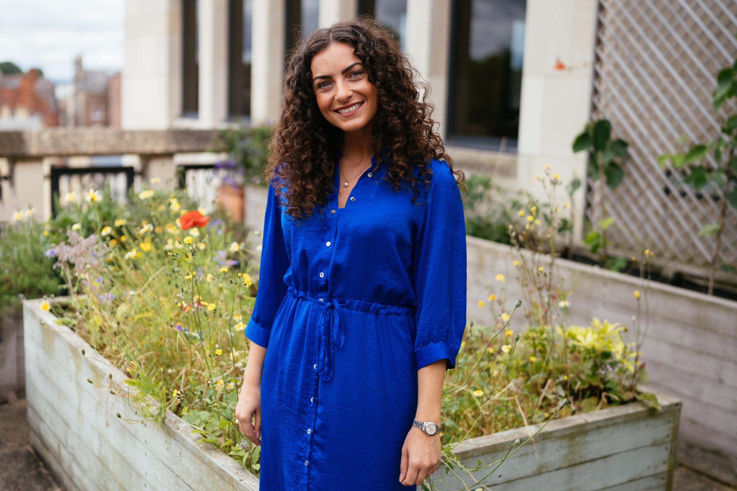Woman stood in front of railings smiling at camera
