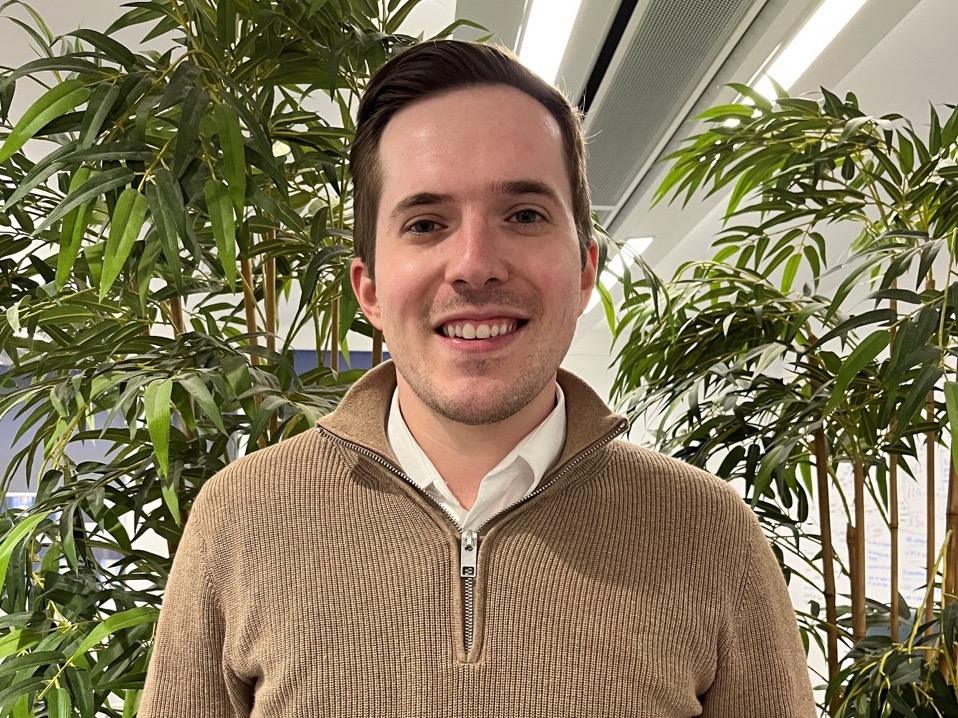 Man stood against a pilar smiling at the camera