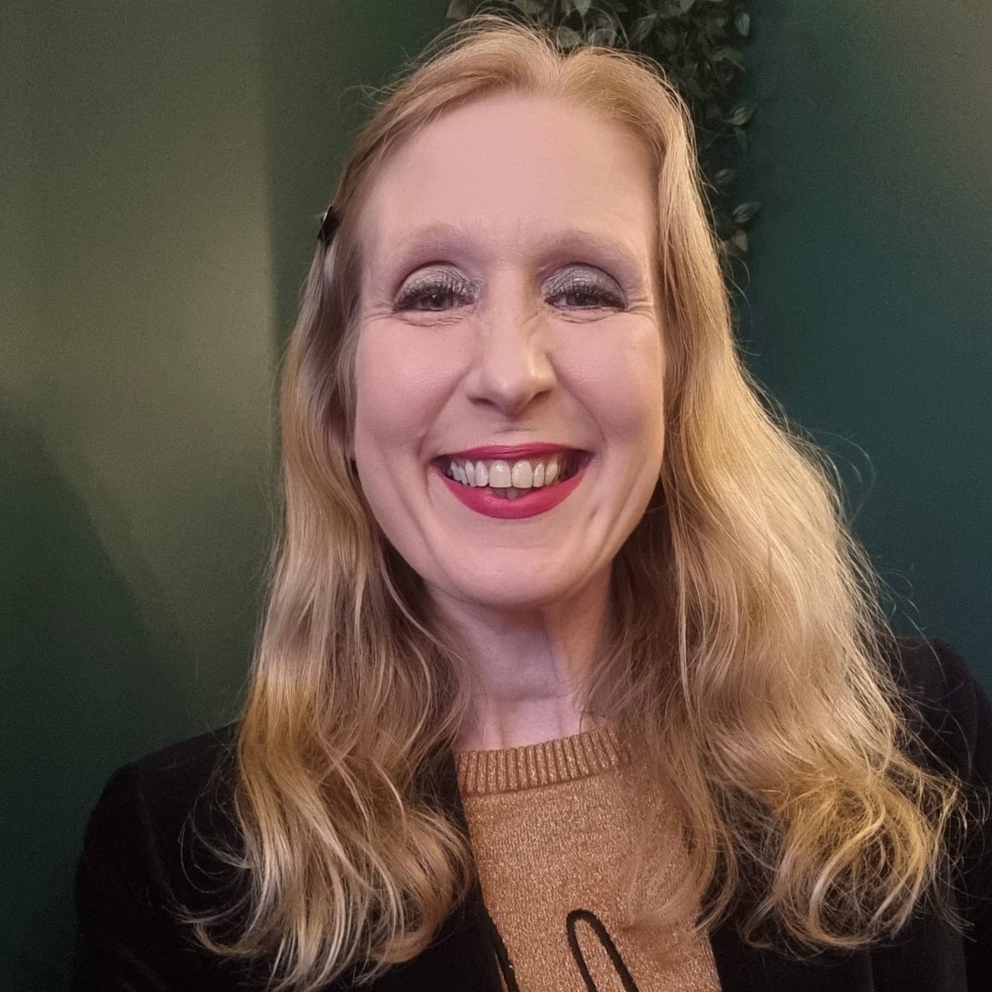 Long-hair woman in an office smiling at the camera