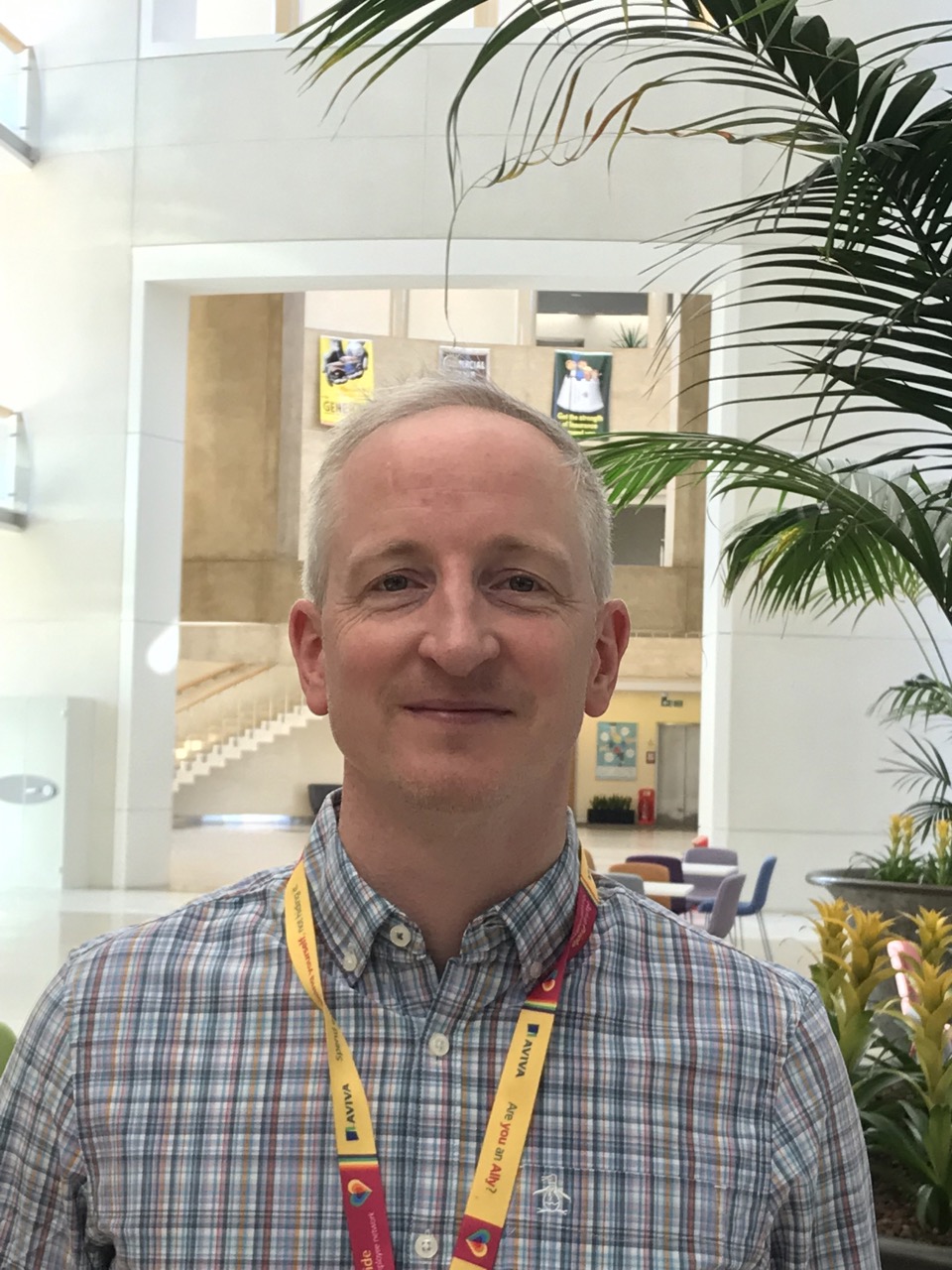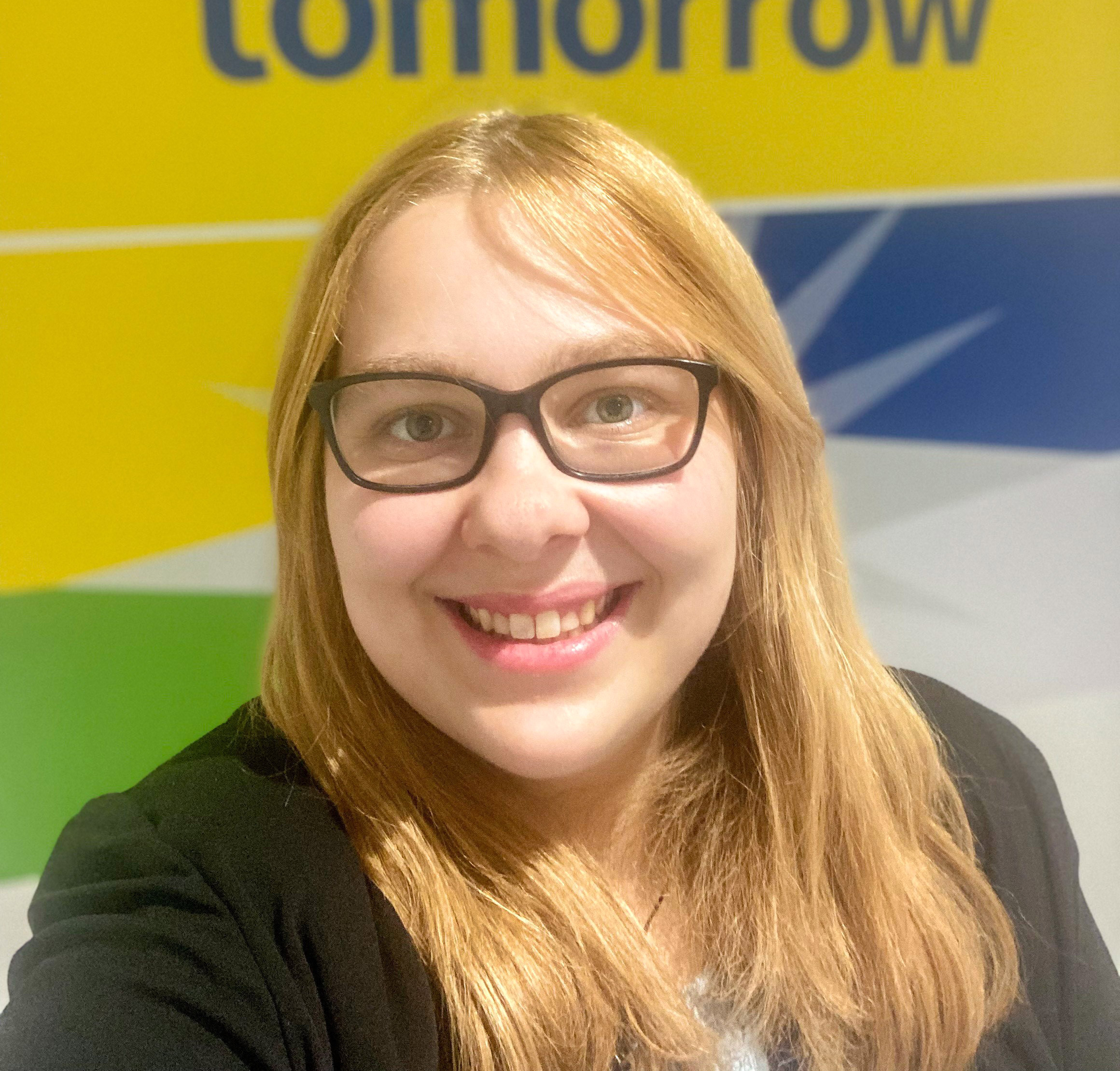 Woman stood by Aviva office doors smiling at camera