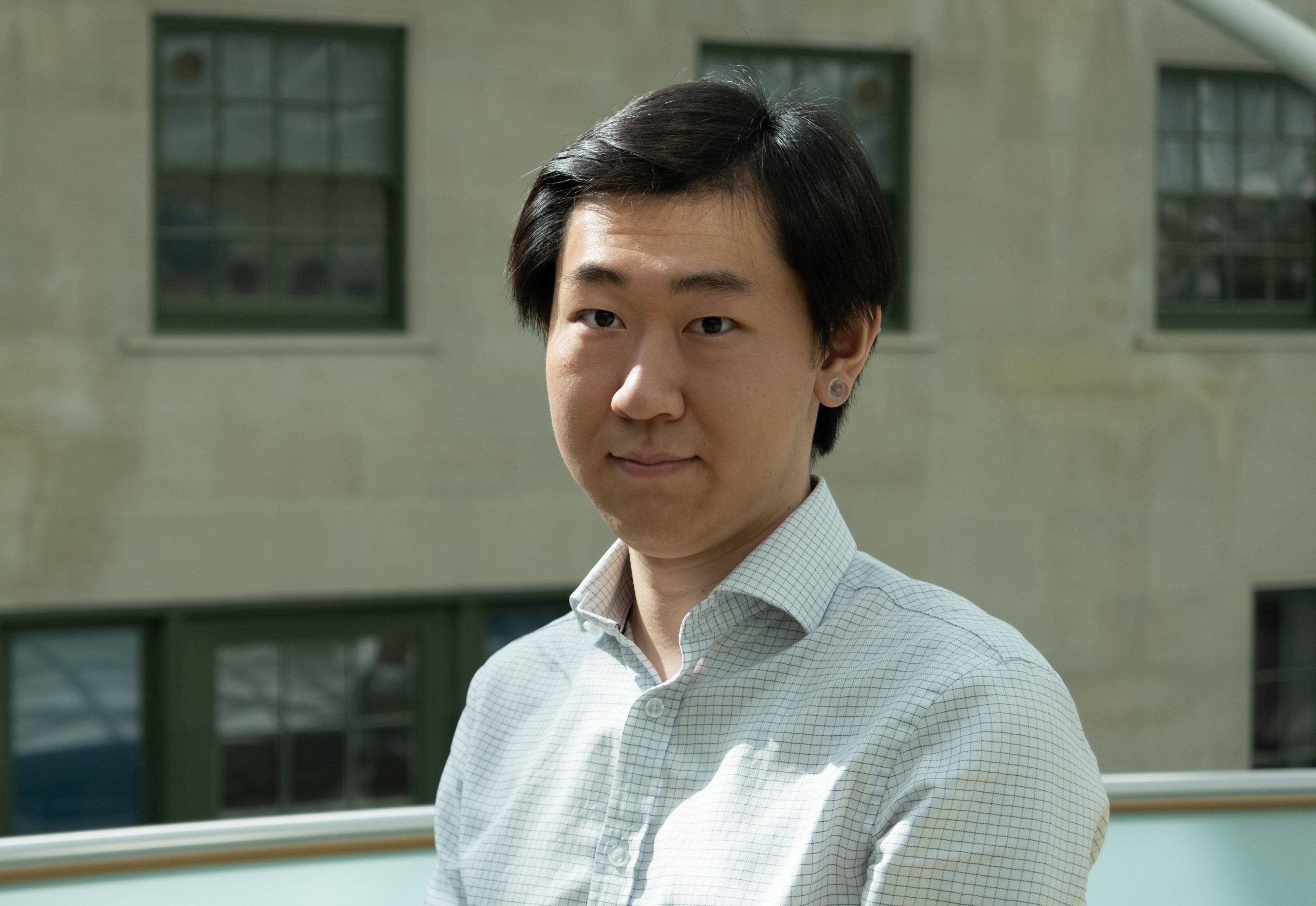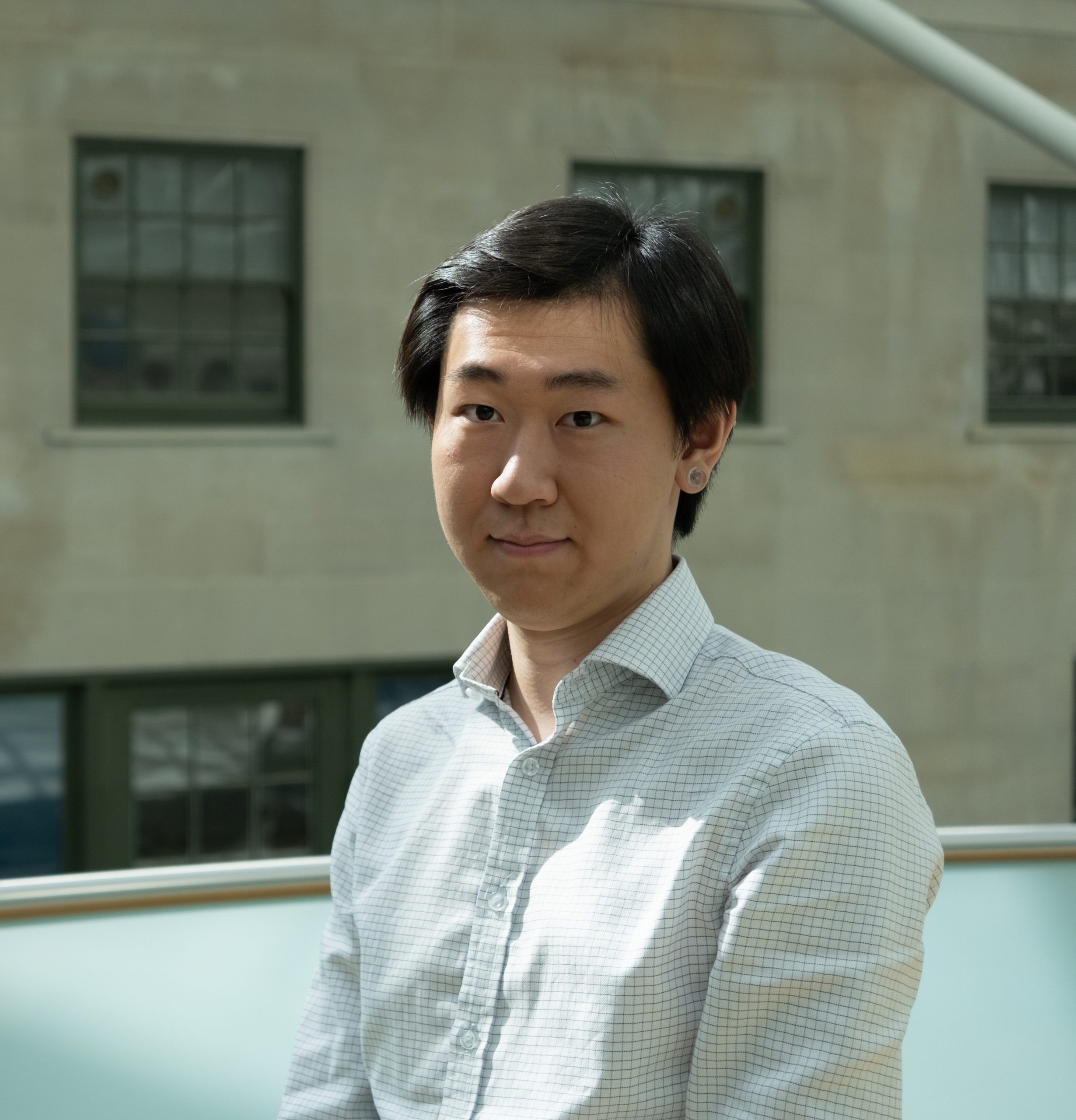 Young man looking into camera, smiling stood outside an architectural building